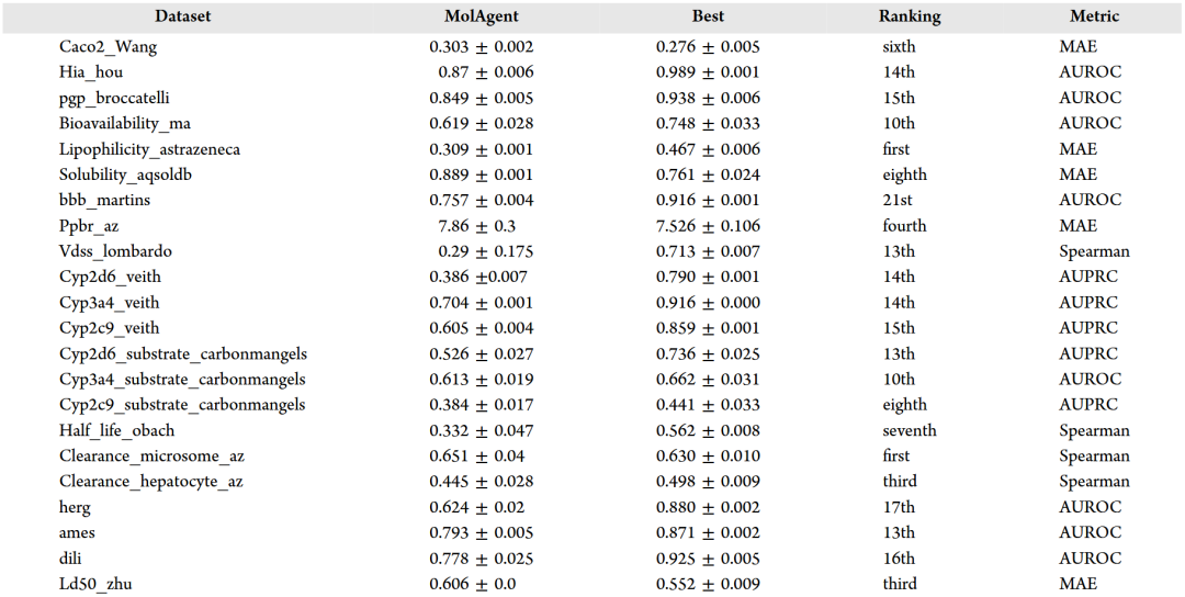 表1 低计算成本预算下,MolAgent在TDC基准中不同ADMET任务的性能表现。