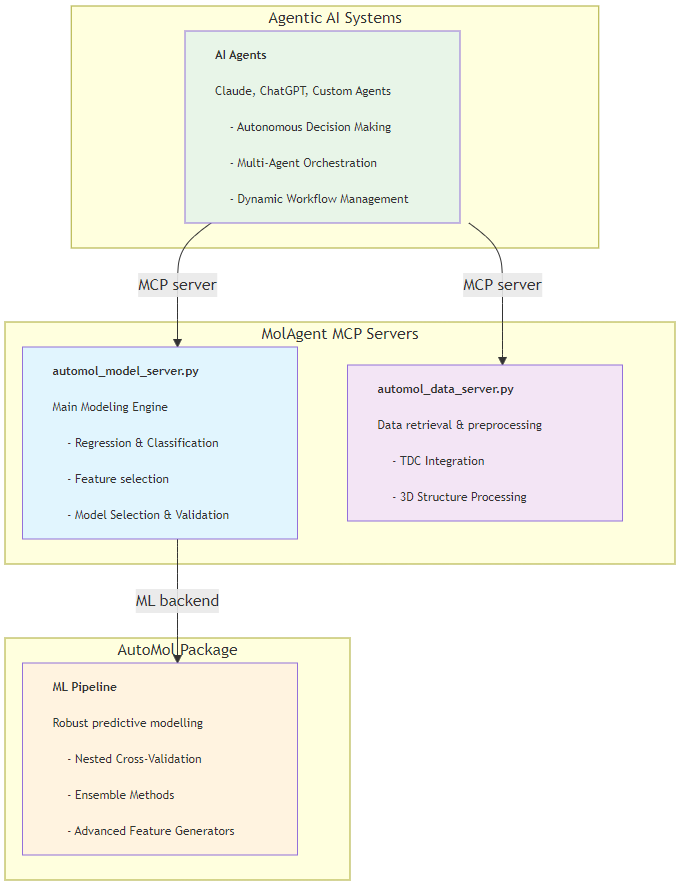 文章提出一个与具体系统无关的智能体AI框架MolAgent,旨在为药物发现早期阶段提供高保真的分子性质建模。该平台集成了自动化特征工程、稳健的模型选择、先进的集成方法以及全面的验证体系,从而确保模型的最优精度与鲁棒性。MolAgent提供了一个完全自动化、端到端的工作流程,旨在实现智能体系统的无缝执行。其遵循的模型上下文协议保障了与多样化智能体AI基础架构的互操作性,从而能够灵活集成到未来复杂的药物发现流程中。