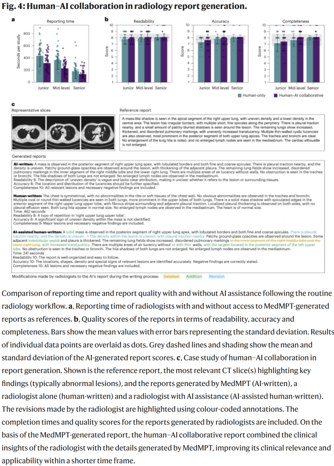 人工与 MedMPT 协作生成的报告在可读性、准确性与完整性上均优于单独人工或AI生成。临床接受度由 67–96% 提升至 75–98%。研究人员指出,AI 作为“协作者”而非“替代者”能最大化临床价值。
