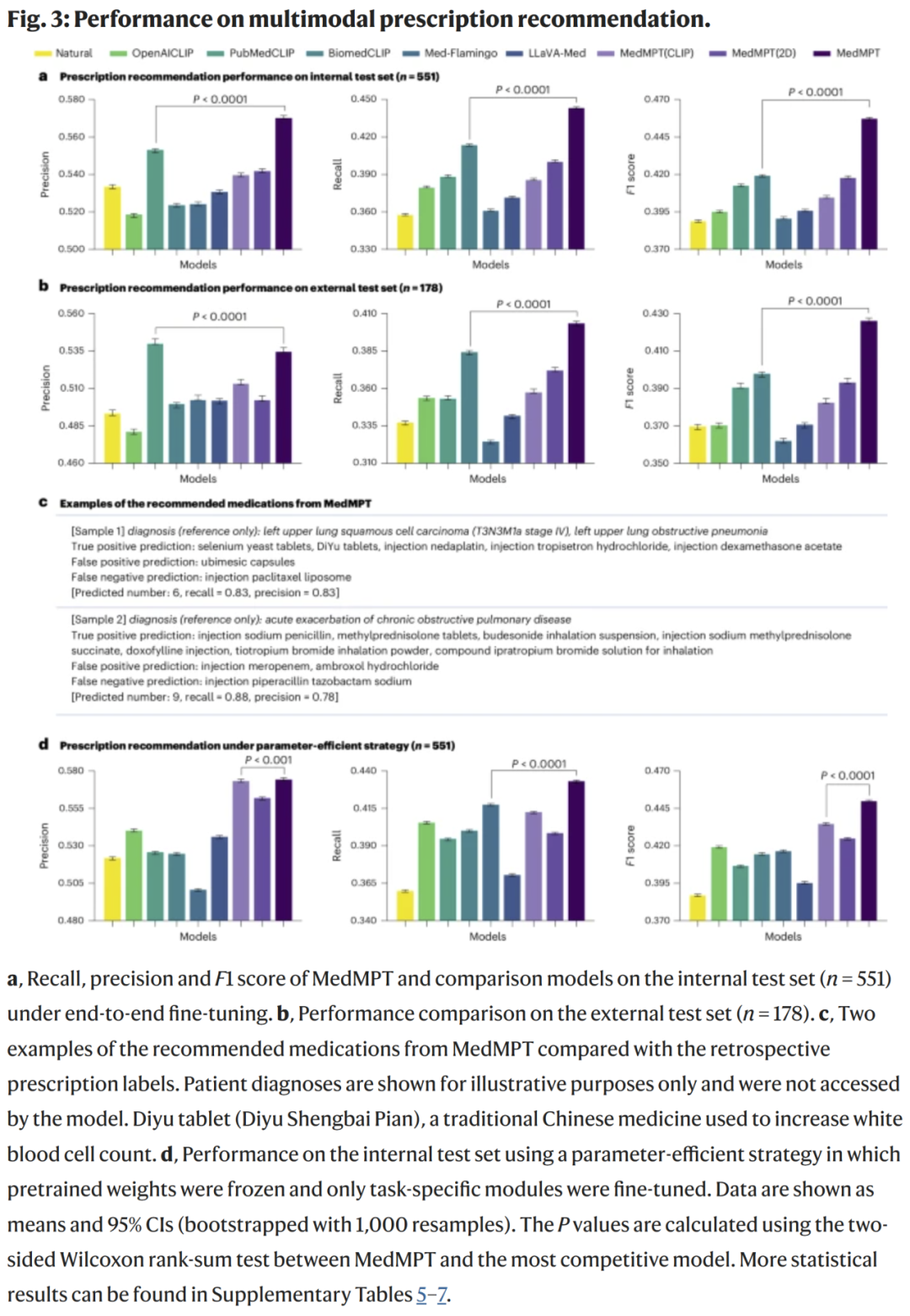研究人员进一步评估 MedMPT 在多模态药物推荐任务中的表现,输入包含患者的 CT、报告、检验及用药记录。