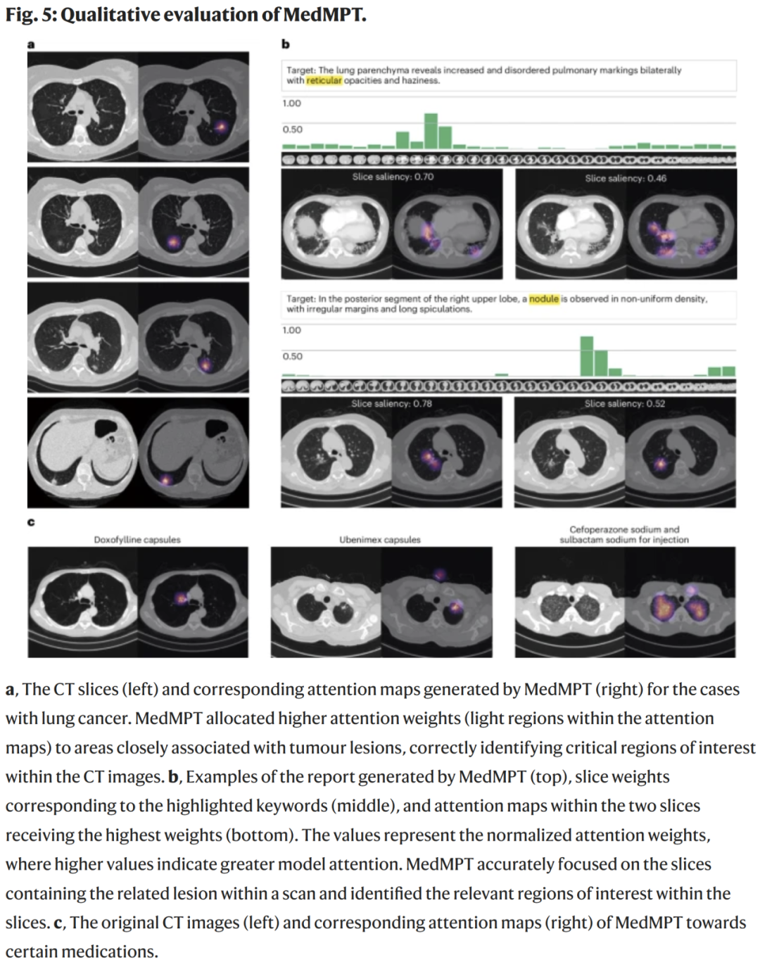 在肺癌诊断案例中,MedMPT 的注意力热图准确聚焦于肿瘤区域、条索影与磨玻璃影等关键特征;在报告生成与用药预测中,模型的跨注意力映射显示出语义–空间对齐能力,可追踪关键词与病灶区域的对应关系。模型能高亮与药物作用靶点相关的肺部区域,显示其在临床可解释性上的潜力,有助于医生信任与验证。