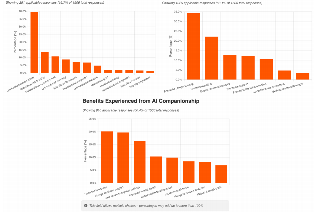 AI伴侣带来的主要益处。超过六成用户提到 AI 伴侣给他们带来了积极影响:最常见的是孤独感减少、随时能获得陪伴与支持、心理健康改善。