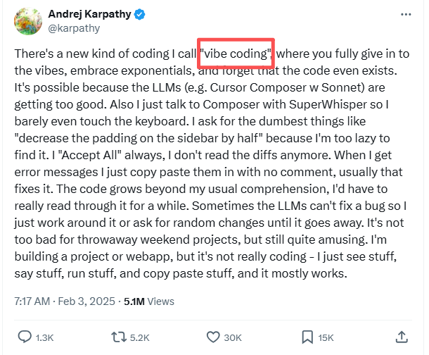 Karpathy只是为这种转变命了名。却没想到,「vibe coding」这个词像是戳中了时代的笑点。