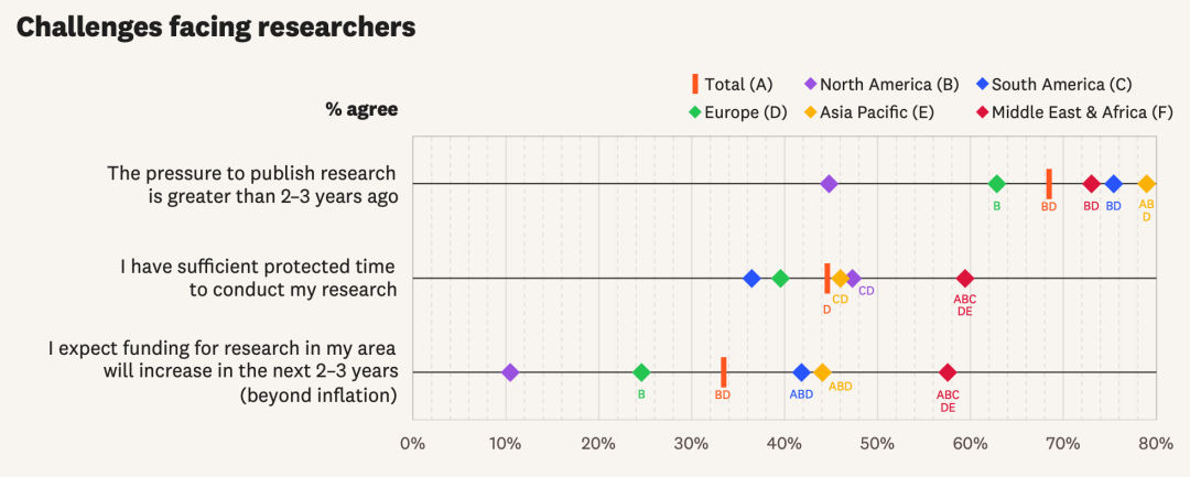 从地区差异看,北美科研人员对时间与经费最悲观,而亚太地区相对更乐观,科研资源的全球分布正在悄然变化