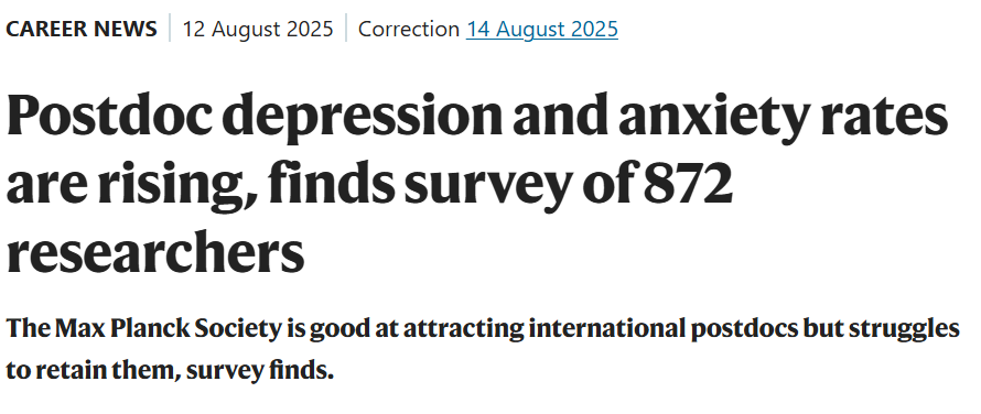 这种焦虑感并不是个例。Nature在今年8月对872名博士后进行调查,结果显示,近一半的人出现过焦虑或抑郁症状。