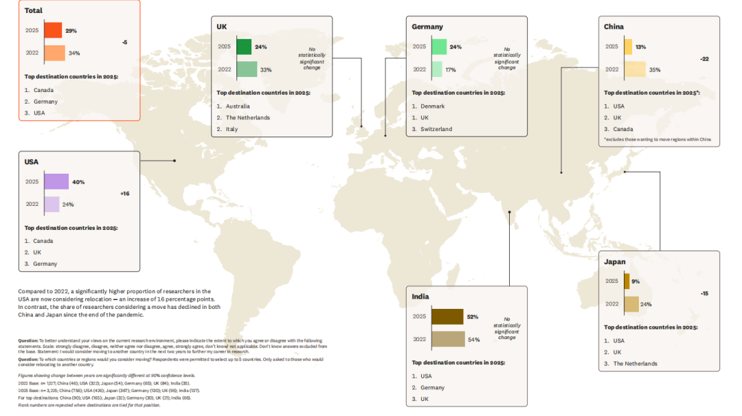 与此同时,中国的研究者则在「留守」这一项上跌至13%,意味着不少科学家开始将目光投向科研生态更友好的国家。