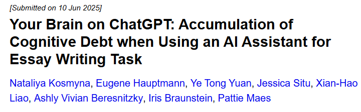 麻省理工学院研究员Nataliya Kosmyna的脑电实验让这个问题更具象:她让54名学生分别用ChatGPT、用搜索引擎、或纯靠自己写一篇短文。
