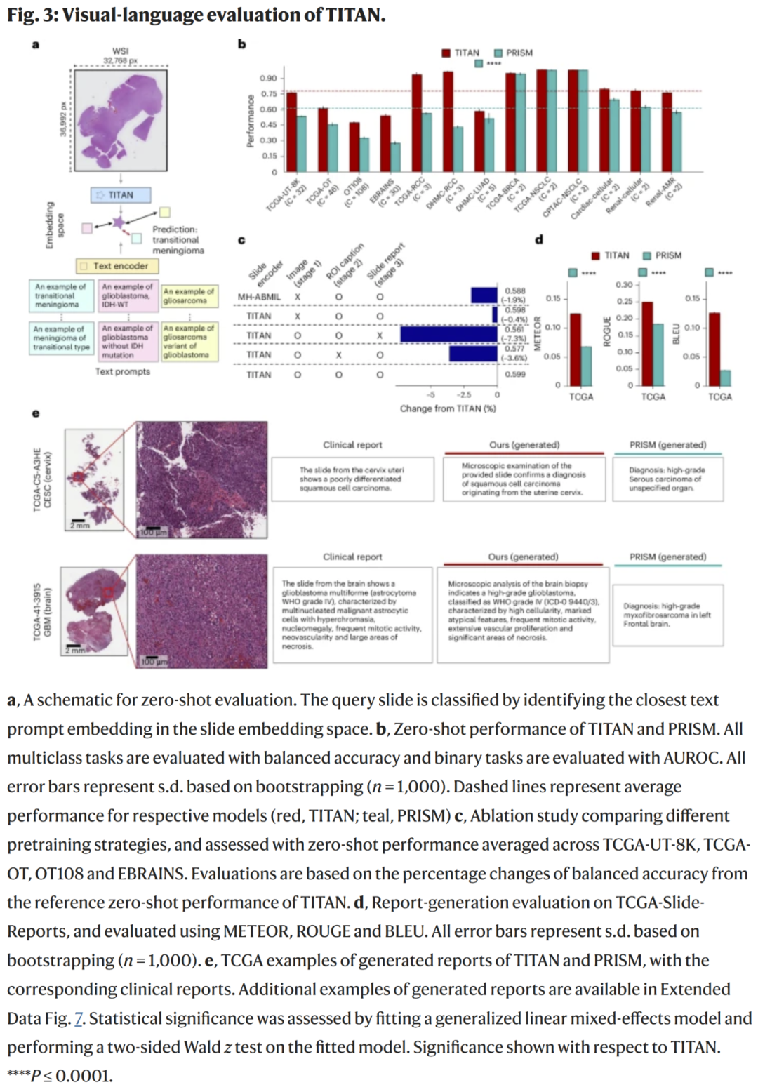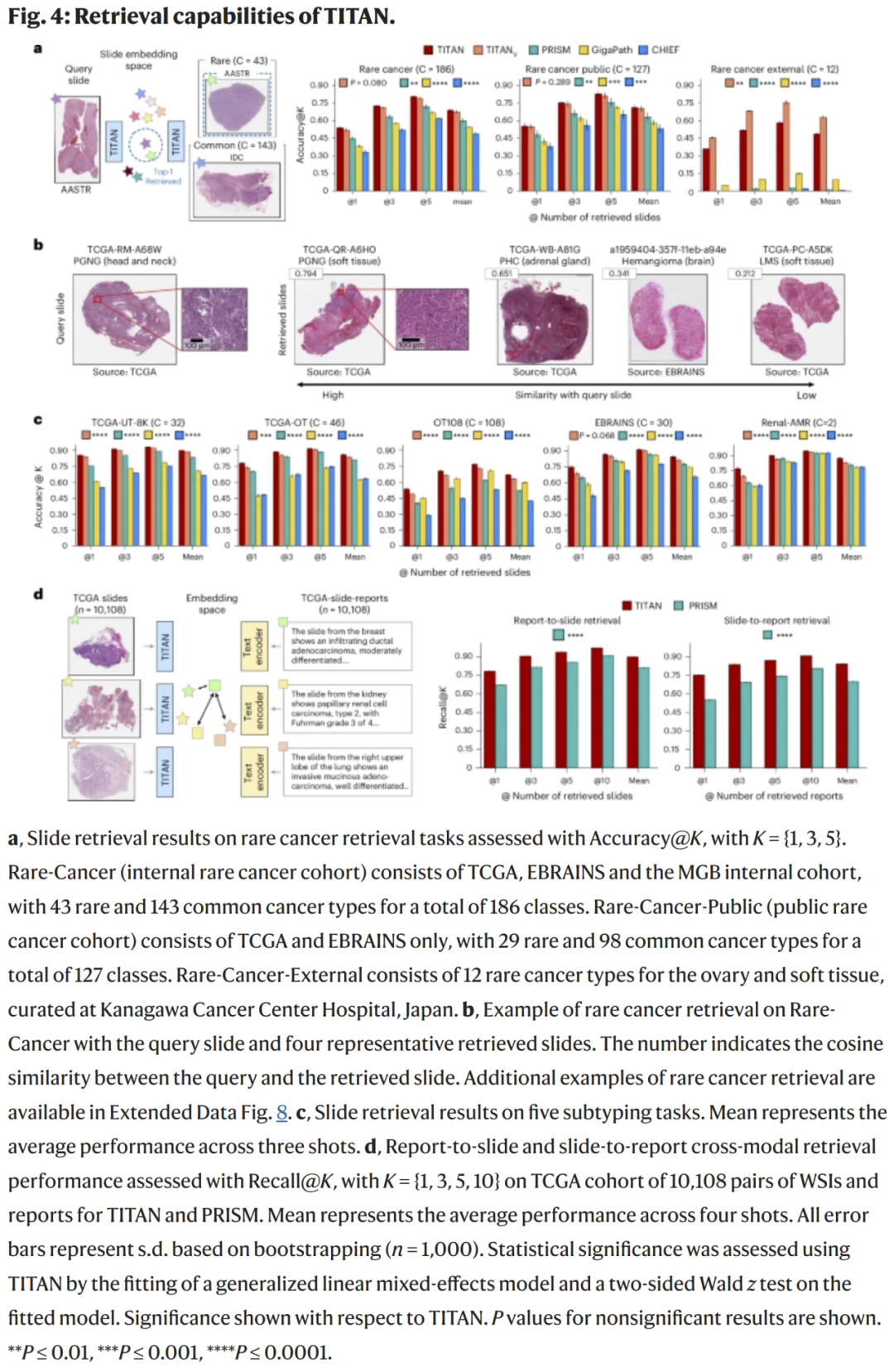 TITAN同时在报告生成、病例检索与特征聚类中表现出一致的语义连贯性,说明模型具备从诊断到报告生成的可迁移能力。