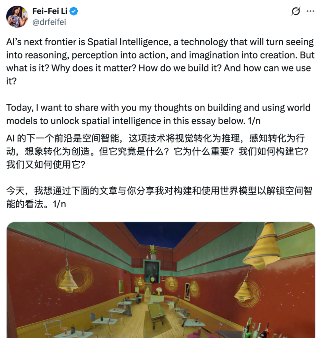 AI 的真正魅力,在于扩展我们的能力,使我们变得更加富有创造力、更加紧密相连、更高效、更有成就感。空间智能正是这种愿景的体现 —— 一种能让创作者、照护者、科学家与梦想家实现曾经不可能之事的 AI。这一信念,是我将空间智能视为人工智能下一个伟大前沿的根本动力。