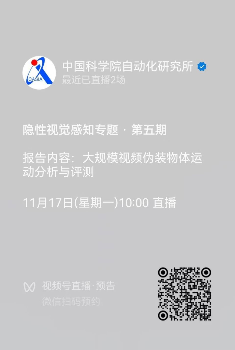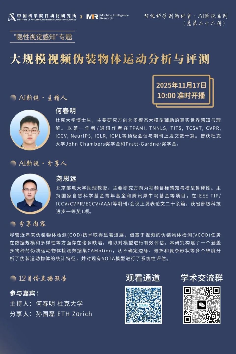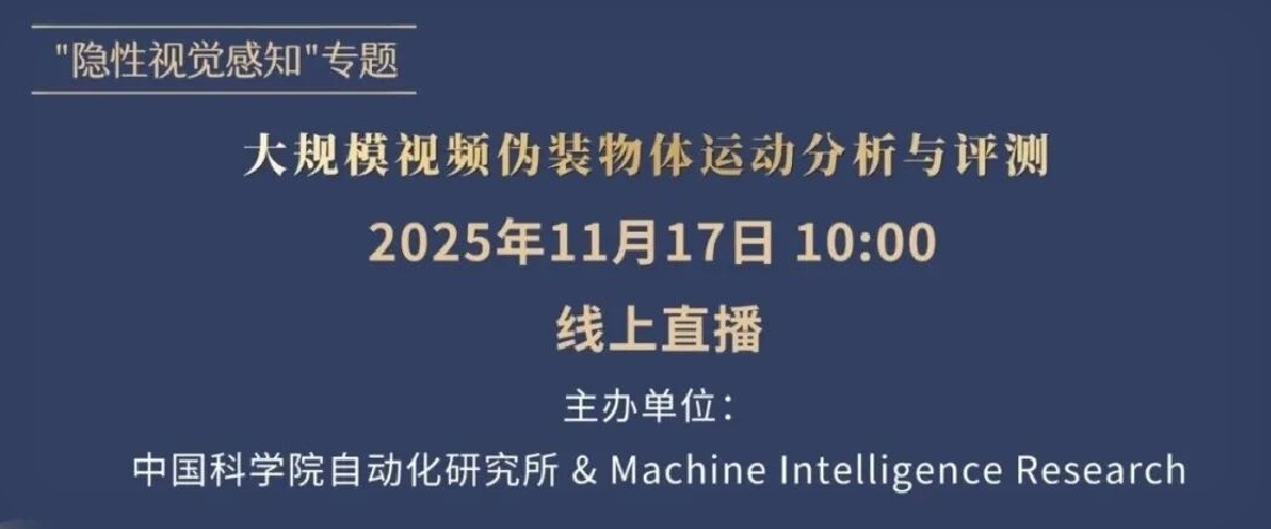 智能科学创新讲堂本期聚焦"隐性视觉感知"专题。"隐性视觉感知"专题专注于伪装目标检测、透明物体分割、阴影检测等隐性视觉感知前沿研究,并积极探索其在医疗影像(如息肉检测)等领域的应用拓展。旨在让这个重要而富有挑战性的研究主题更加活跃,通过开放的学术交流不断迸发新的思想火花,推动学术社区繁荣和领域持续进步,促进计算机视觉与医疗影像等交叉领域的深入交流与合作,逐步打通不同应用场景的技术壁垒。