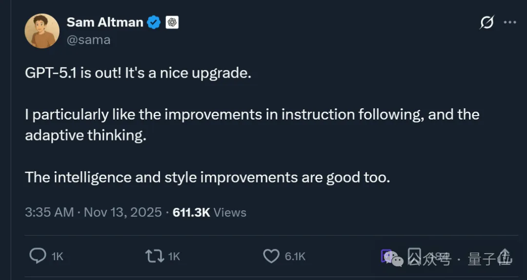 模型直接升级为 GPT-5.1,官方主打更智能、更具对话性。