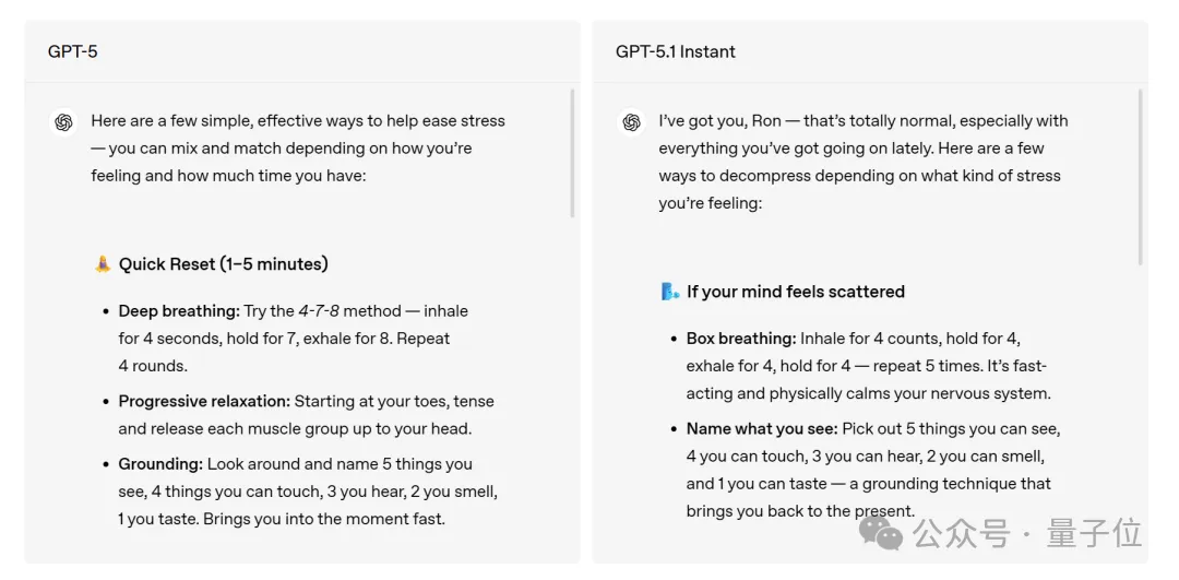 面对同一个问题,老版 GPT-5 和新版 GPT-5.1 Instant 的回答语气截然不同。