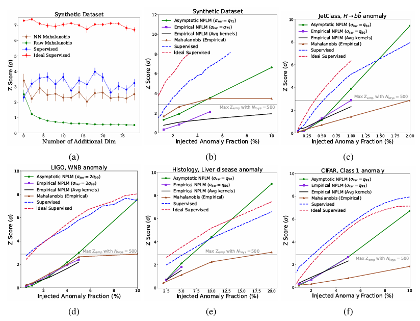 对于 LIGO 和 JETClass 数据集,所提方法在 Z 分数为 3 时接近有监督上限,这在各自领域堪比或超过了所有异常检测算法。虽然天文学和粒子物理学长期以来一直利用统计上演进的异常检测技术,但将其应用于组织学,说明了科学学科间方法的迁移性。