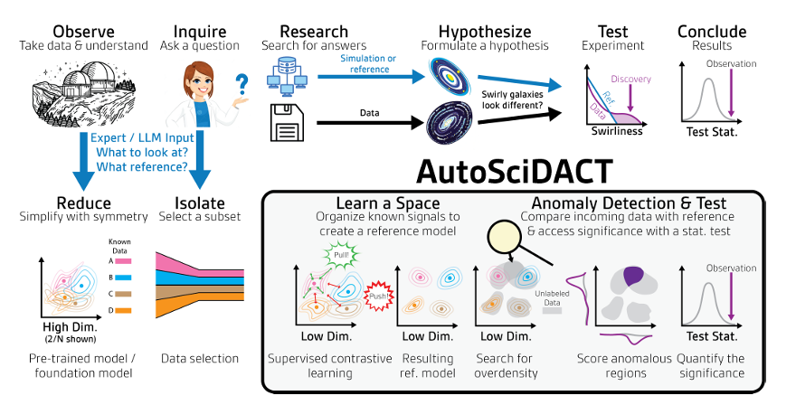 针对科学发现面临的挑战,来自麻省理工学院(MIT)、威斯康星大学麦迪逊分校(UW-Madison)以及美国国家科学基金会人工智能与基本相互作用研究所(IAIFI)的团队,提出一种名为 AutoSciDACT(Automated Scientific Discovery with Anomalous Contrastive Testing)的方法,可用于自动化检测科学数据中的「新发现」,从而简化科学探究。研究人员通过在天文学、物理学、生物医学、图像学等真实数据集和一个合成数据集上对其进行了验证,结果表明该方法在所有领域中对少量注入的异常数据都具有很强的敏感性。