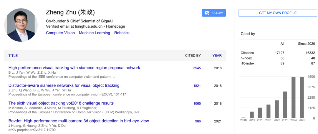 Google Scholar显示,朱政的论文被引数达到1.7w+,h-index为50。