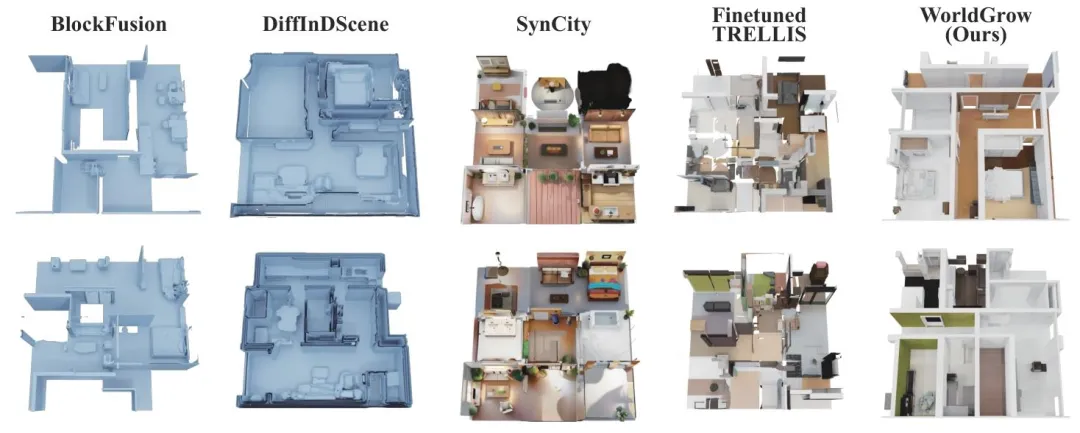 比如联合上海交通大学、华中科技大学推出的世界模型WorldGrow,可以单卡30分钟生成272㎡室内场景,且场景具有真实、连贯的纹理。