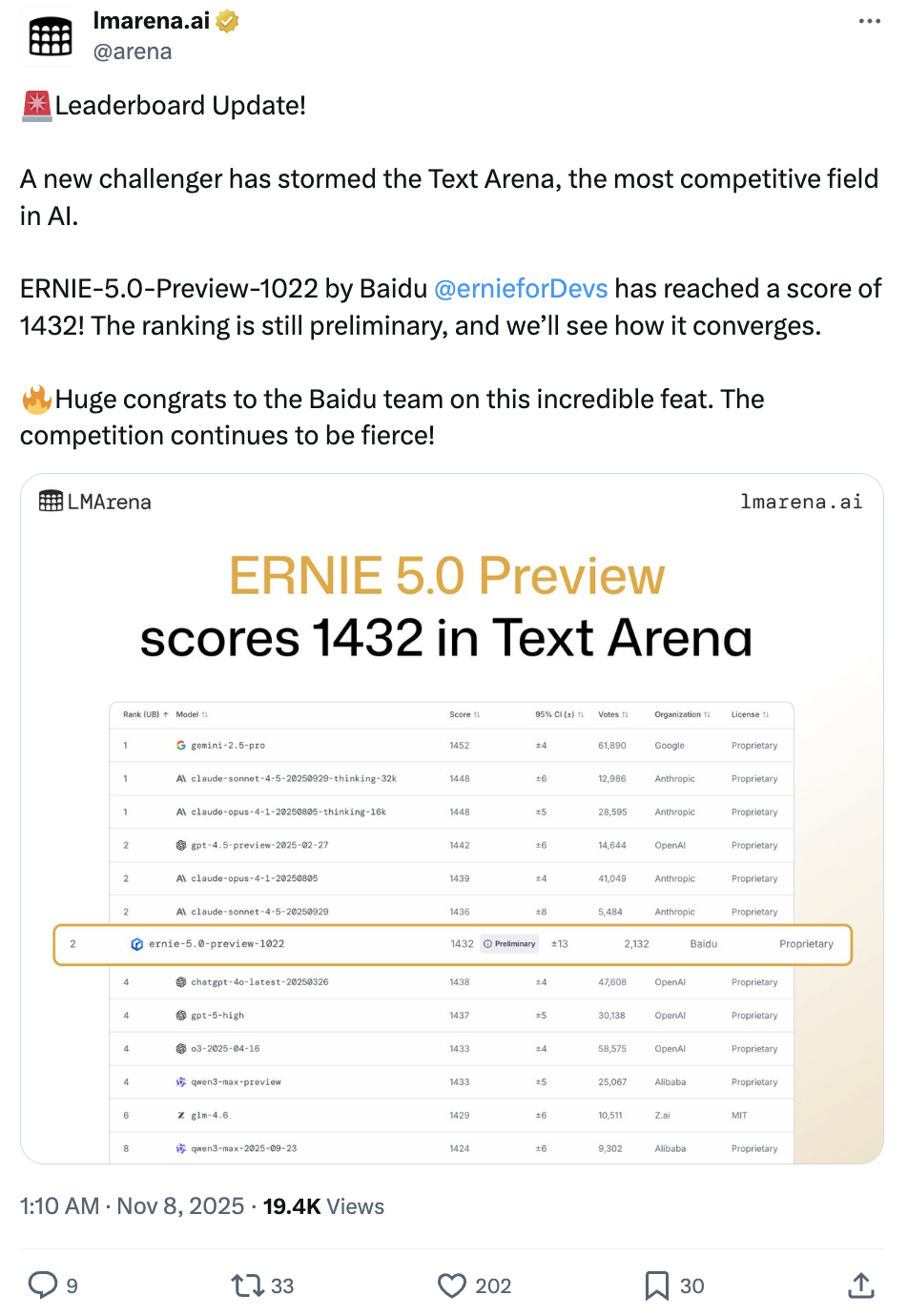 就在几天前,文心5.0 Preview(ERNIE-5.0-Preview-1022)还闪现大模型竞技场LMArena,在文本排行榜(Text Arena)上得分1432,与gpt-4.5-preview、claude-opus-4-1、claude-sonnet-4-5等并列全球第二,位居国内第一。