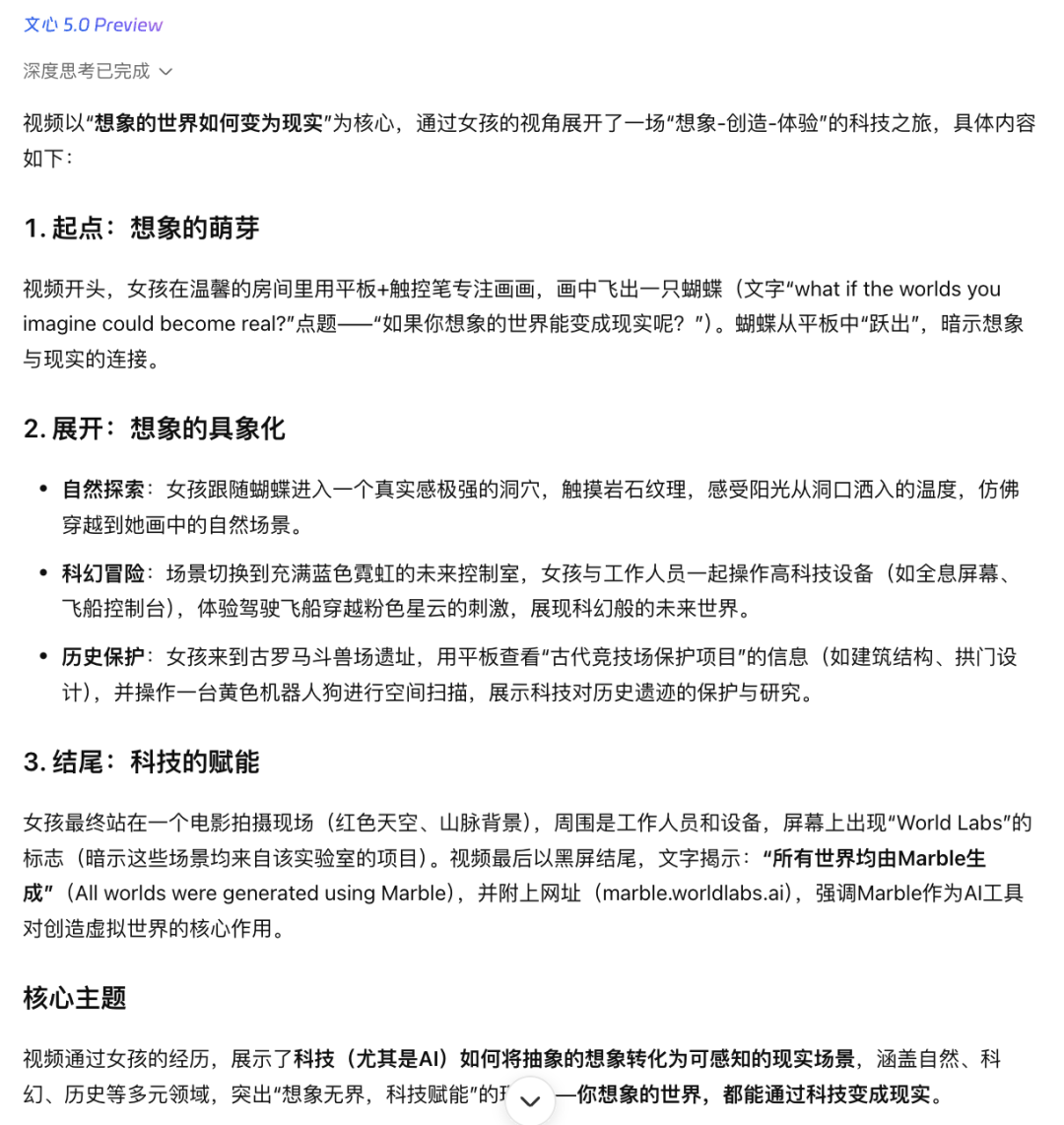 以李飞飞团队最新成果Marble的宣传片为例,它不仅能精准提炼核心主题,还能条理清晰地梳理完整情节,就算台词很少,它也能根据画面讲清楚细节。