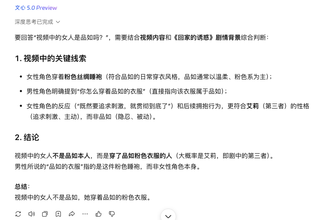 结合视频中的台词,文心5.0 Preview轻松答对: