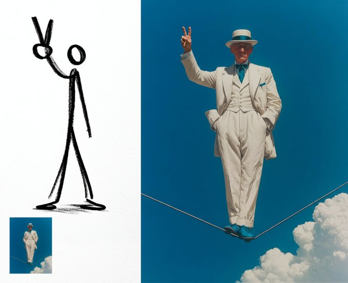 模型能够识别图片上添加的提示框和文字说明,精确执行其中描述的生成要求(如"看向下方的吉他"),并在最终输出中自动移除所有指令元素,生成一张"干净"的成品图像,实现从带注释的草图到完整作品的自动化转换。