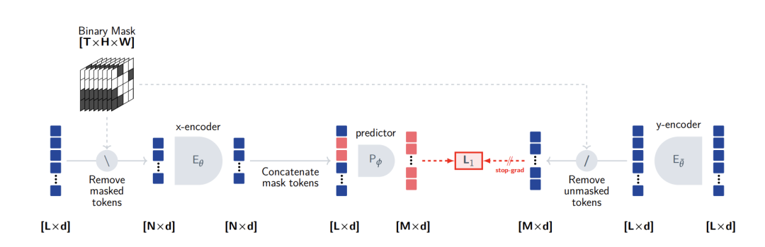 最后,预测网络的输出通过 L1 损失回归到预测目标。预测目标对应于y-encoder的输出。