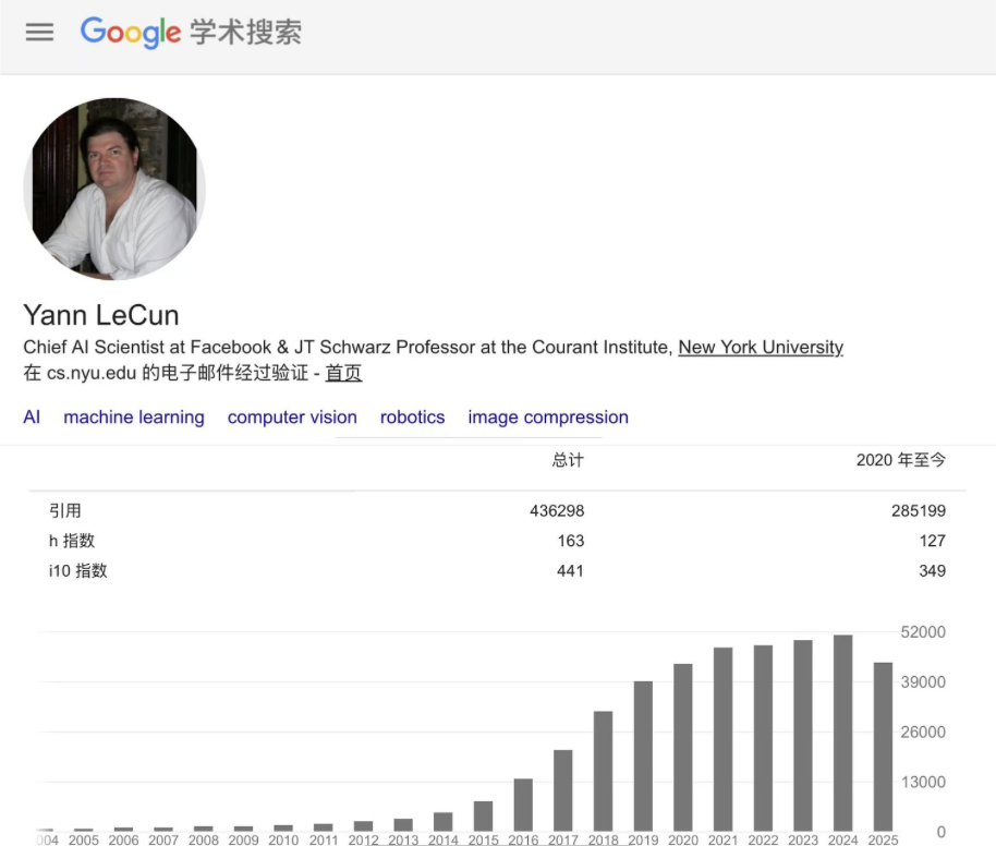 自2013年加入Meta以来,LeCun的个人被引飙升,约为406919次,占总数的93%。