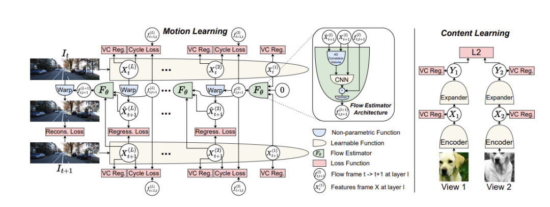 架构通过在视频中使用光流估计学习运动,并通过图像视角的联合嵌入学习内容,以多任务方式共享编码器。其光流估计架构基于PWC-Net。