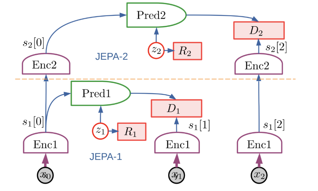此外,为了应对长期规划问题,JEPA还可以进一步通过分层架构(即H-JEPA)来增强其抽象能力。