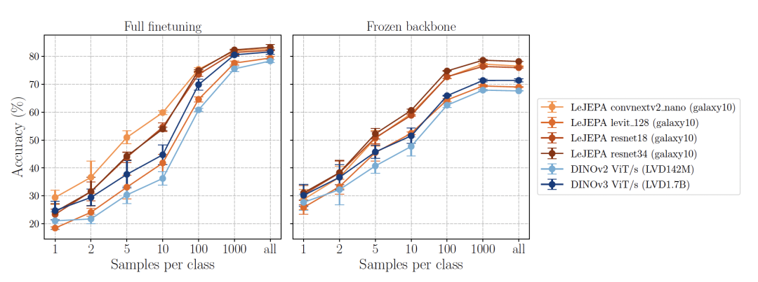特别地,在领域特定的数据集(如Galaxy10、Food101)上,LeJEPA在直接在目标数据上预训练时超越了基于DINOv2的迁移学习方法。