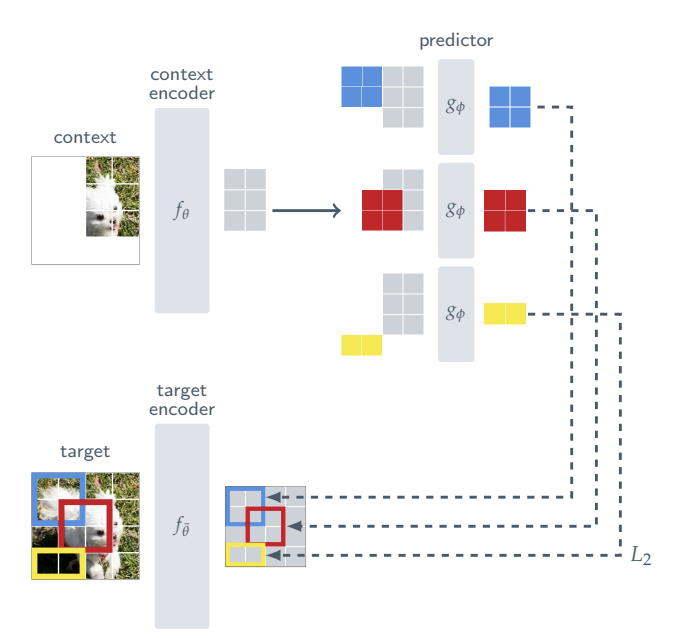 预测器接收上下文编码器的输出,并根据位置标记(以颜色显示)预测特定位置的目标块表示。