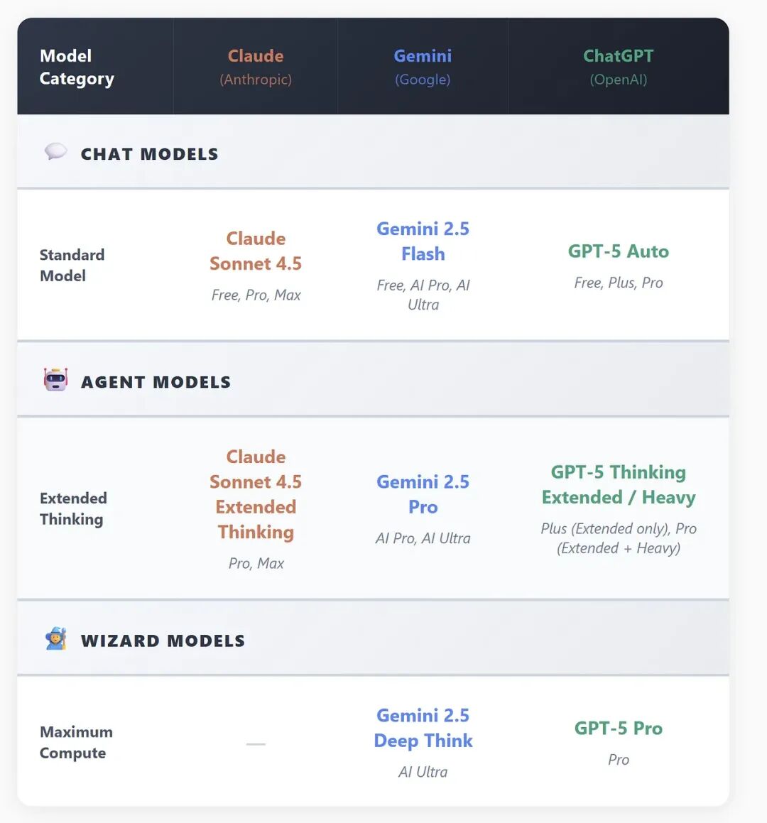 Claude、Gemini、ChatGPT三大系统在不同模型层级下的功能分布。Wizard 级模型仅出现在Gemini Deep Think与GPT-5 Pro中。