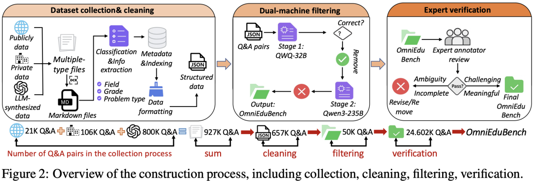 为了确保基准的质量与挑战性,OmniEduBench的构建过程堪称严苛,历经四道关卡: