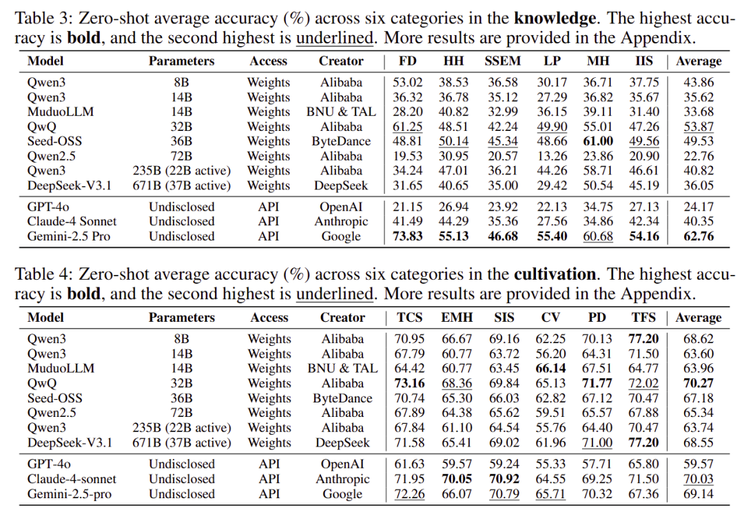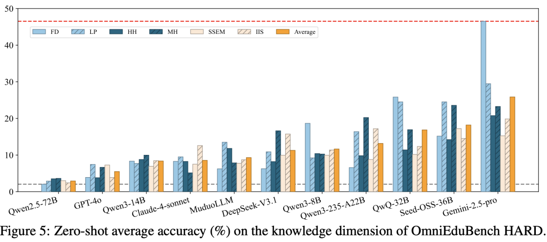 研究团队在OmniEduBench上对11个主流的闭源和开源LLM(包括GPT-4o, Gemini-2.5 Pro, Claude-4 Sonnet, Qwen系列, DeepSeek-V3.1等)进行了全面测试,结果发人深省: