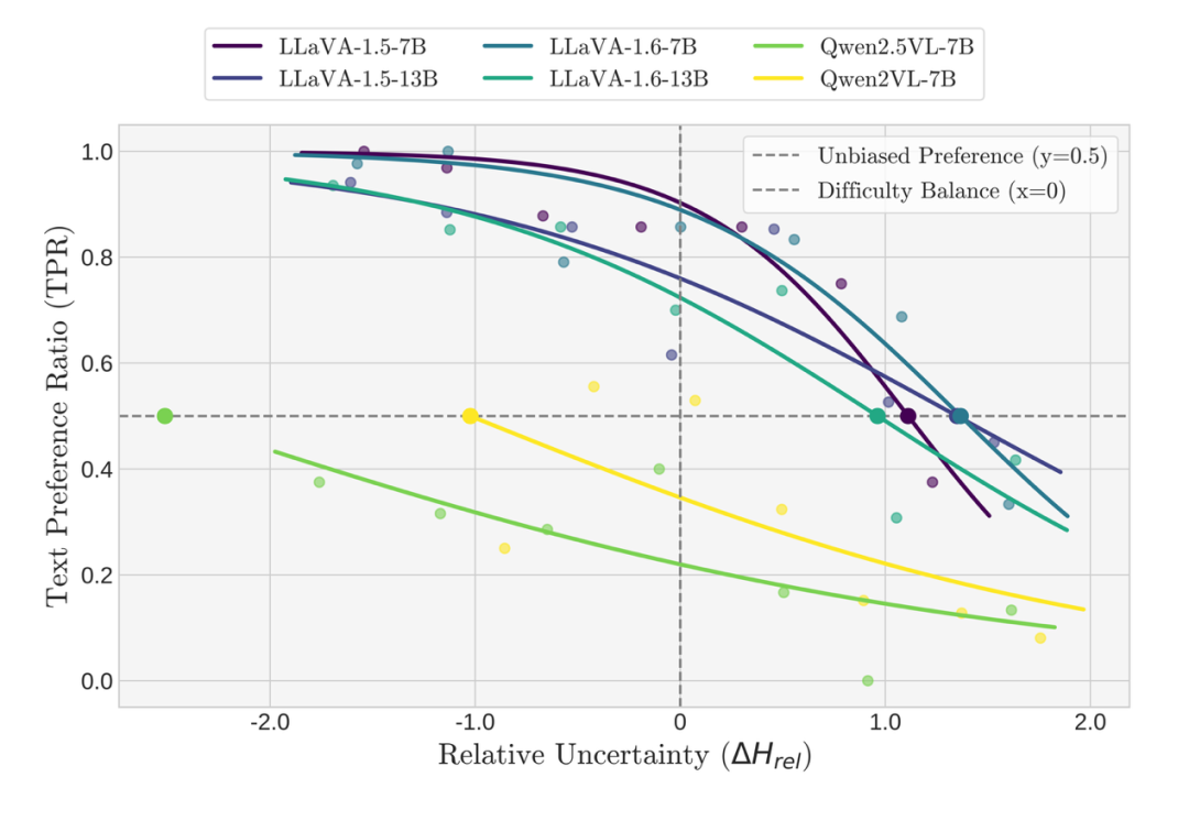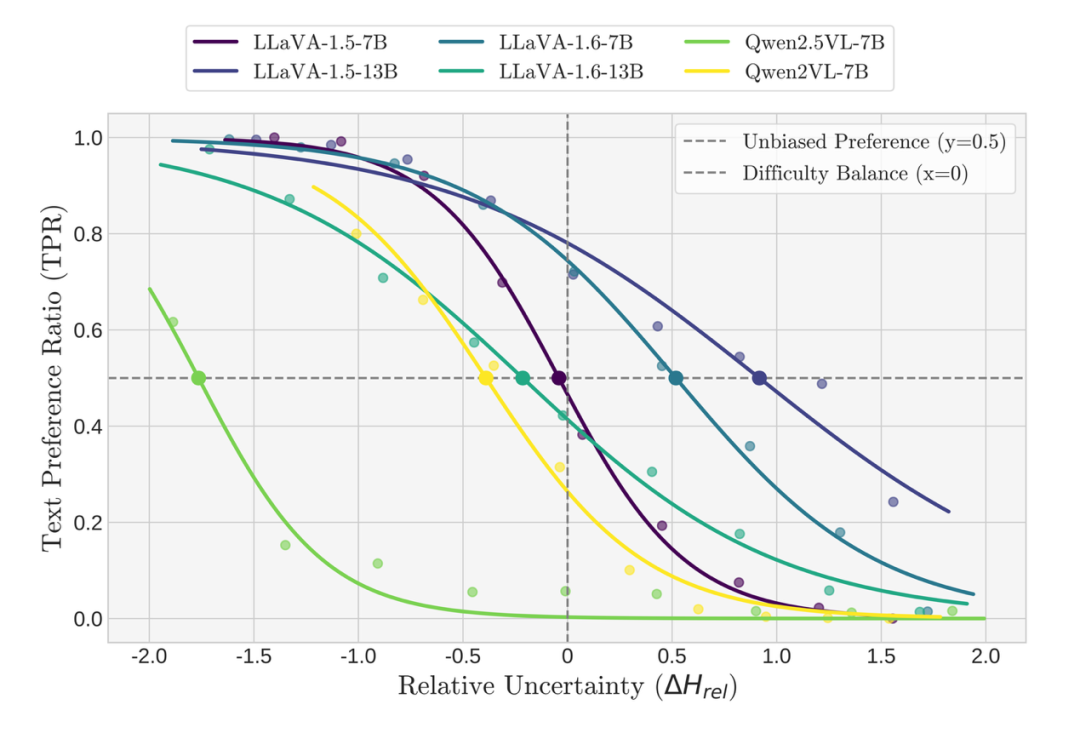 虽然所有模型都遵循这条单调法则,但它们的曲线在“相对不确定性”轴上的位置各不相同。研究者将曲线穿过50%概率线的那个点定义为“平衡点”。这个“平衡点”提供了一个原则性的、可量化的指标,用以衡量我们之前提到的“固有模态偏好”。