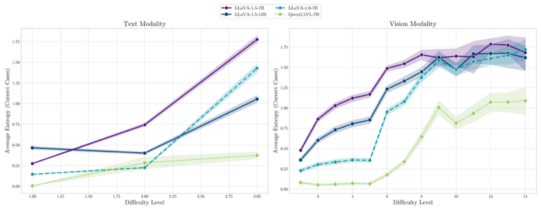 图2:展示构造数据集上文本和视觉单模态上的输出熵随着难度的变化趋势。