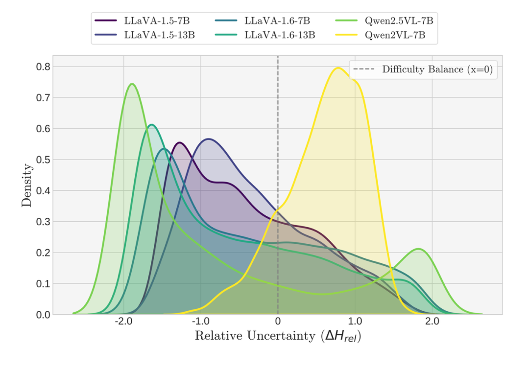 对Qwen2-VL而言,更多的数据点落在了“视觉更容易”(即视觉不确定性更低)的区间;而Qwen2.5-VL面临的却是前述的“文本更容易”的分布。