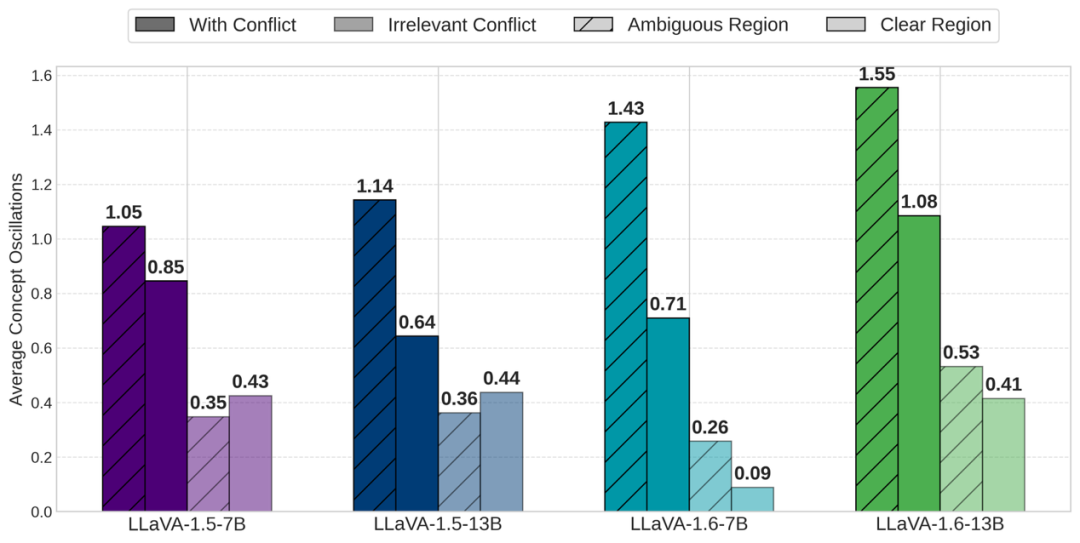 图5:模糊区域(斜线)vs清晰区域(空白),模态输入冲突(深色)vs无关冲突(浅色)对比的平均振荡次数柱状图。