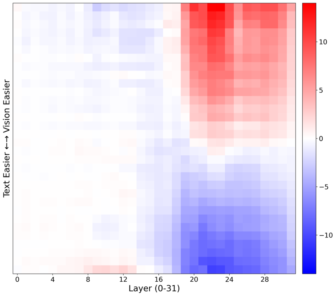 图6:文本模态答案与图像模态答案logits差值。红色代表跟随图像模态信心更强,蓝色代表跟随文本,颜色越浅代表越摇摆,纵轴从下往上文本相对不确定度更高(即更难)。