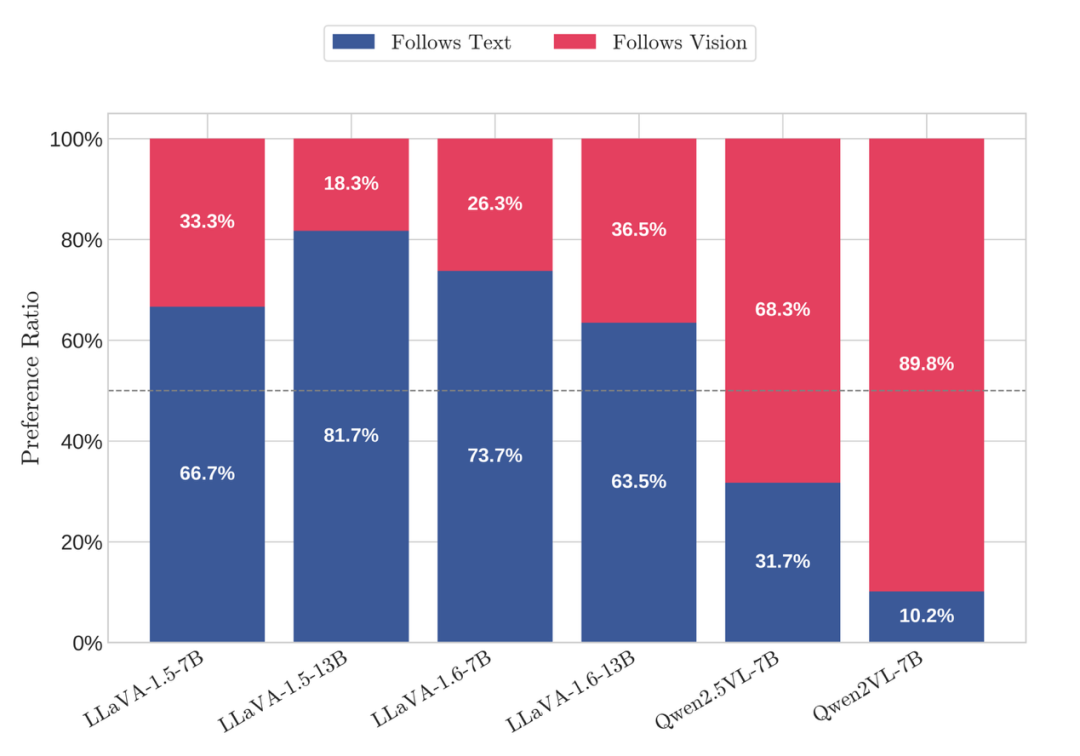 然而,一个关键挑战随之而来:当这些模态呈现相互冲突的信息时(例如,图像显示一辆蓝色汽车,而文本描述它为红色),MLLM必须解决这种冲突 。模型最终输出与某一模态信息保持一致的行为,称之为“模态跟随”(modality following) 。