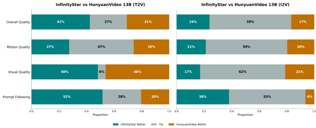 在和HunyuanVideo的人类偏好评估中,InfinityStar-8B也取得了比HunyuanVideo-13B更好的效果,尤其是在指令遵循方面展现出了显著的优势。