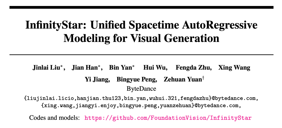 而这篇来自字节跳动商业化技术团队的论文,则是提出了一个名叫InfinityStar的方法,一举兼得了视频生成的质量和效率,为视频生成方法探索更多可能的路径。