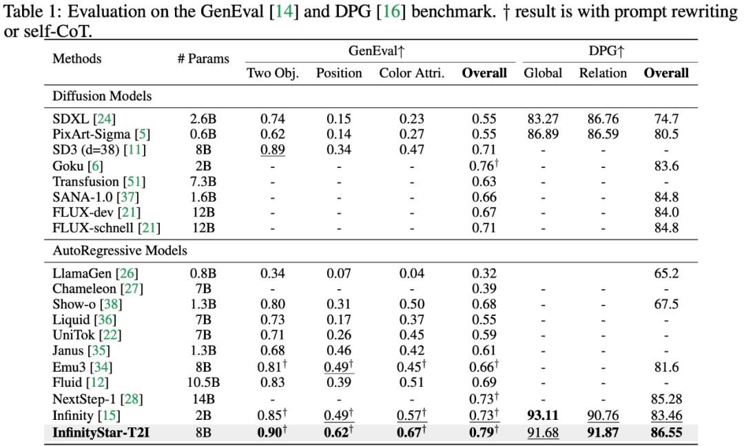 在如此方法之下,实验结果显示,在文生图(T2I)任务上,InfinityStar在GenEval和DPG两项基准上取得了优异的表现,尤其在位置、物体关系上展现出了明显的优势。