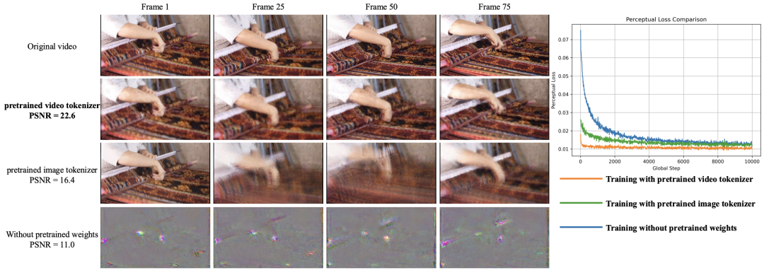 训练一个离散的视觉分词器(Tokenizer)通常非常耗时。研究人员发现,相比于从零开始训练,继承一个已预训练的连续视觉分词器(如Video VAE)的结构和权重,能显著加快离散分词器的收敛速度,使其更快达到高保真度的重建水平。