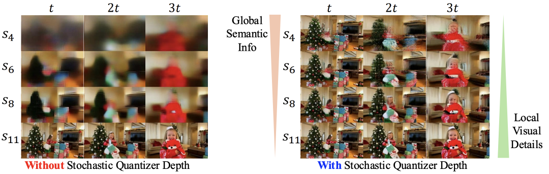 为此,InfinityStar引入了一种名为随机量化器深度的正则化技术。在训练时,随机丢弃(Discard)后面精细尺度的Token,迫使模型在仅有前面粗糙尺度Token的情况下也能重建出有意义的信息。这使得信息在不同尺度上分布更均衡,显著提升了模型的学习效率和最终的生成质量。