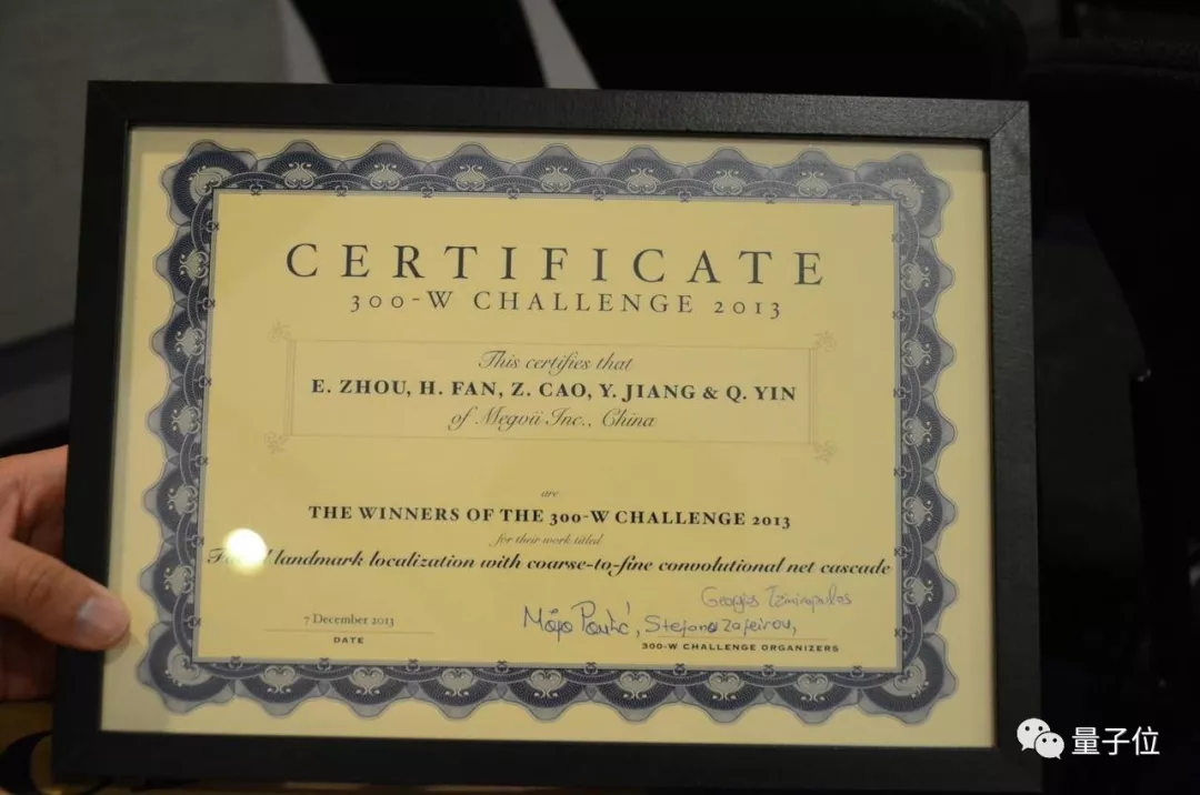 入职不久,他便和同事一起发表论文,为旷视赢得公司历史上首个技术评测世界冠军——ICCV 2013 300 Faces in-the-Wild Challenge人脸关键点定位冠军。
