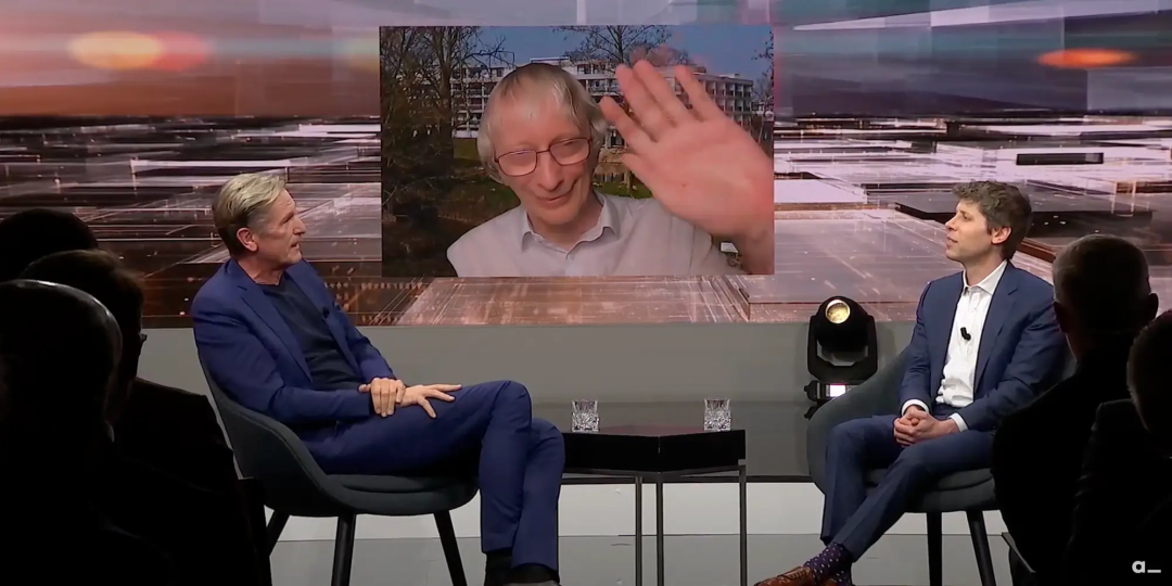在Axel Springer的颁奖典礼上,主持人提到奥特曼最喜欢的一本书是《无穷的开始:世界进步的本源》,于是主办方搞了个「惊喜连线」——作者David Deutsch出现在大屏幕上。