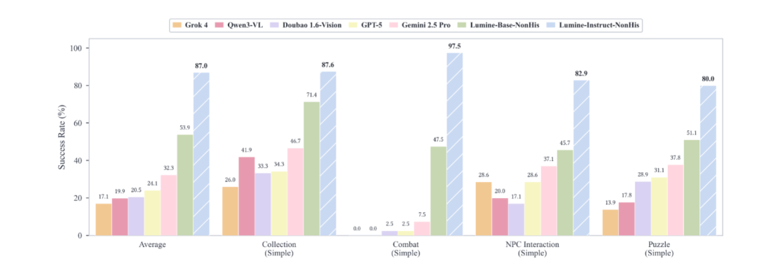 例如简单任务上,Lumine-Instruct的成功率为92.5%,与GPT-5(89.8%)差距较小,但动作连贯性更好。
