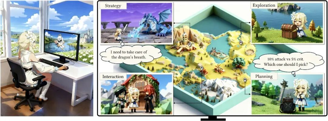 基础交互能力:成功掌握物体交互(如拾取物品、打开宝箱)、2D GUI操作(如点击对话框、切换菜单)、基础移动(跑、跳、爬),总成功率超90%,但该阶段没有目标导向(如不会主动寻找任务物品)。