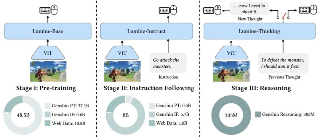 得到的Lumine-Base模型,逐步涌现出物体交互、基础战斗、GUI操作等核心能力,为后续理解游戏机制奠定了基础。