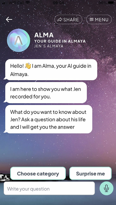 以“档案化”为核心的保存型平台:以 Almaya 与 HereAfter 为例,强调构化叙事、真实性与记忆传承,主要作为“保存”工具。用户在生前录制音视频或上传照片,AI 通过索引与分类组织这些素材,让亲人能够与数字化的“逝者”互动。AI 在其中扮演“档案管理员”,负责检索与播放,而不介入生成新的内容。这类平台追求线性、封闭的记忆观,认为记忆可以被固定、归档、继承。